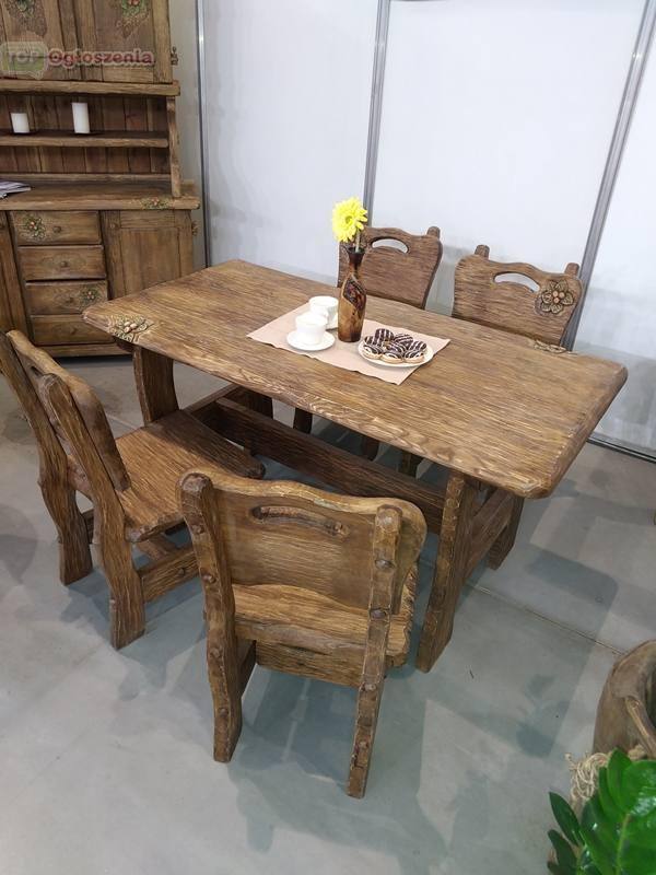 Zestaw mebli drewnianych na 4 osoby – stół i krzesła.